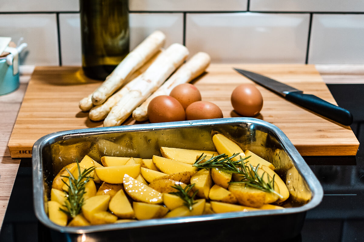 In den letzten Wochen haben wir außerdem mehrfach ein leckeres und einfaches Spargelgericht gekocht, das ihr mit weißem aber auch mit grünem Spargel zubereiten könnt: Gebratener Spargel mit pochiertem Ei, Sauce Hollandaise und Rosmarinkartoffeln aus dem Ofen.