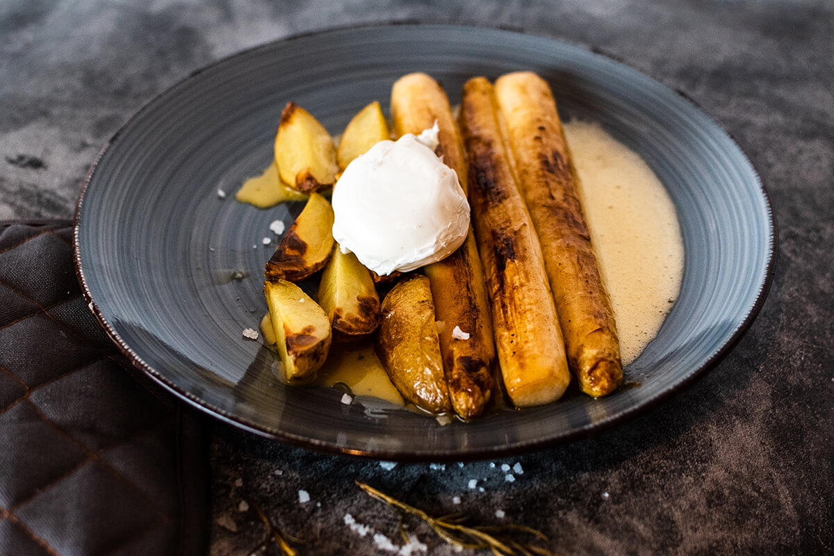 Gebratener Spargel mit pochiertem Ei, Sauce Hollandaise und Rosmarinkartoffeln